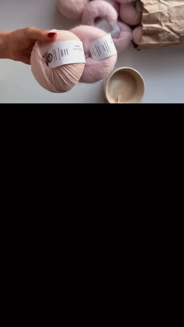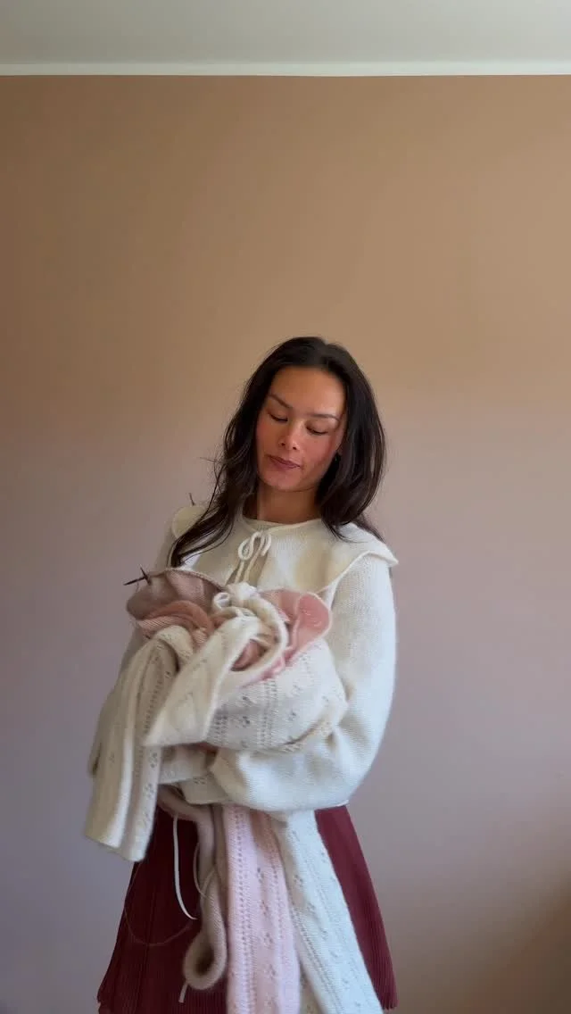 Den brune genseren er strikket i 2 tråder Merino (Farge: Hazel) og 1 tråd Soft Silk Mohair (Farge: Bark) fra Knitting for Olive. Modellen bærer genseren med 46 cm positive ease.